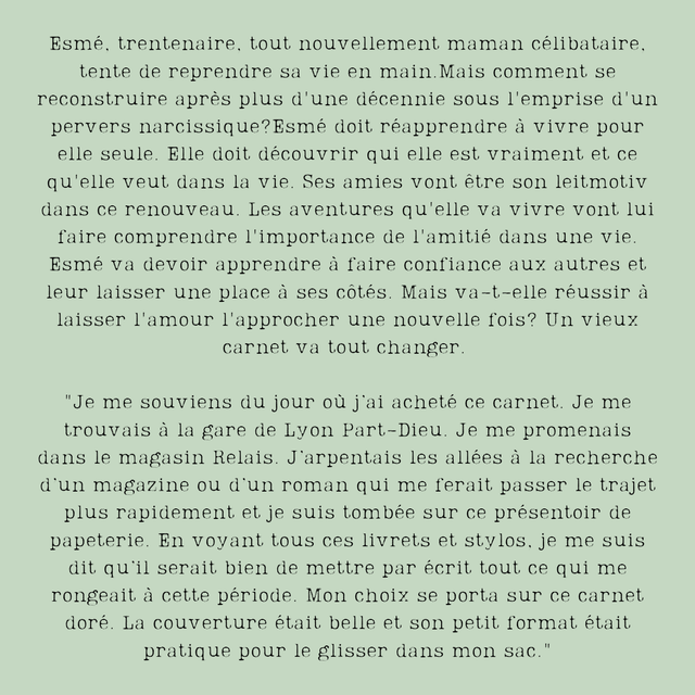 Esmé, trentenaire et toute nouvelle maman célibataire, est déterminée à reconstruire sa vie après plus d'une décennie sous l'emprise d'un pervers narcissique. Elle doit réapprendre à vivre pour elle-même, découvrir qui elle est réellement et ce qu'elle souhaite pour son avenir. Soutenue par ses amies, elle réalise l'importance de l'amitié et apprend à faire confiance aux autres. Mais pourra-t-elle ouvrir son cœur à l'amour de nouveau ? Un vieux carnet, acheté un jour à la gare de Lyon Part-Dieu, va tout changer. Ce carnet doré, choisi parmi d'autres pour sa couverture élégante et son format pratique, devient le témoin silencieux de son voyage intérieur. À travers ses pages, Esmé explore ses émotions, découvre sa force et trace un chemin vers un avenir lumineux.