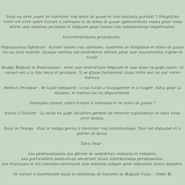 Gardez toutes vos adresses, numéros de téléphone et mots de passe en un seul endroit. Chaque section est clairement définie pour une consultation rapide et facile. Avec une couverture élégante et une mise en page claire, ce carnet est à la fois beau et pratique. Il se glisse facilement dans votre sac ou sur votre bureau.