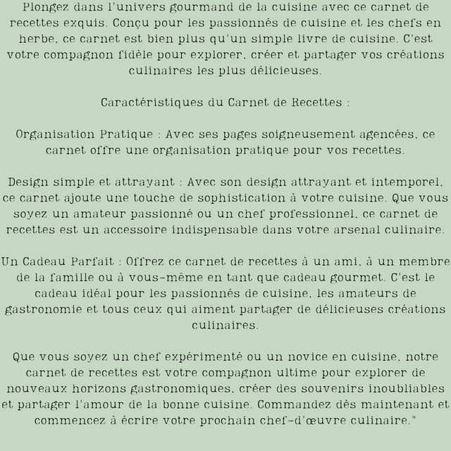 Plongez dans l'univers gourmand de la cuisine avec ce carnet de recettes exquis. Conçu pour les passionnés de cuisine et les chefs en herbe, ce carnet est bien plus qu'un simple livre de cuisine. C'est votre compagnon fidèle pour explorer, créer et partager vos créations culinaires les plus délicieuses.