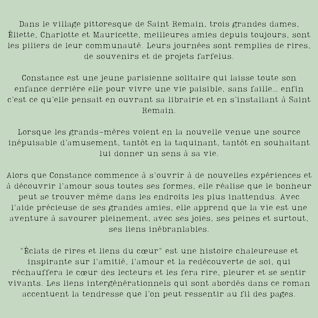 À Saint Remain, trois grands-mères inséparables illuminent la vie du village. L'arrivée d'une libraire solitaire bouleverse leur habitudes. Entre taquineries et conseils, elles lui ouvrent les yeux avec bienveillance. Ensemble, elles découvrent que le bonheur se cache parfois là où on ne l'attend pas. Ce roman est une ode à la vie, où les générations se mêlent avec tendresse et émotion.