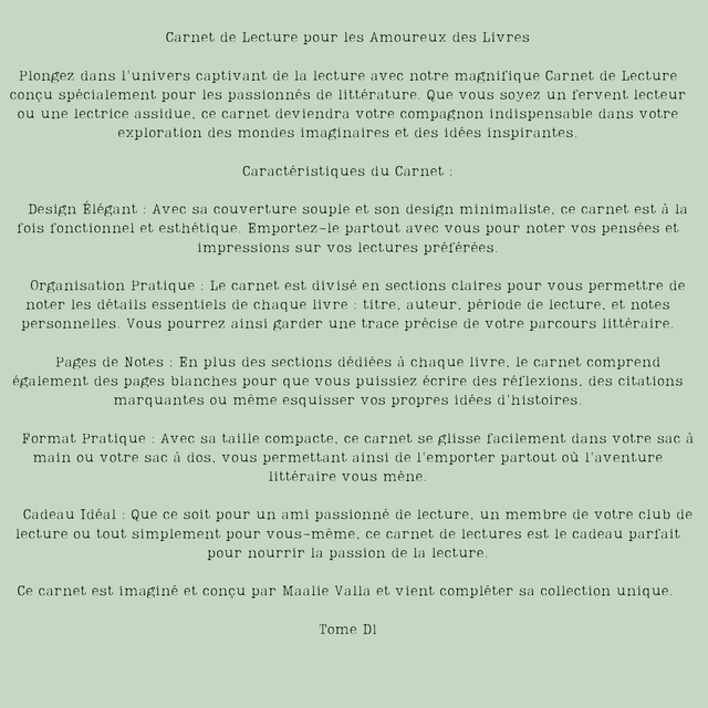 Plongez dans l'univers captivant de la lecture avec notre magnifique Carnet de Lecture conçu spécialement pour les passionnés de littérature. Que vous soyez un fervent lecteur ou une lectrice assidue, ce carnet deviendra votre compagnon indispensable dans votre exploration des mondes imaginaires et des idées inspirantes.